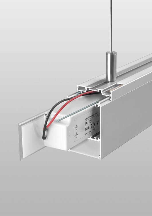 Aufhängung: Das Abhängungselement PUSZ-LIN-ZD ermöglicht die Stromversorgung innerhalb der LED-Leuchte sowie eine horizontale Abhängung in Längsrichtung mittels Stahlseil und die Befestigung PUSZ-PRET-ZD mittels Metallstab. Mit dem Befestigungsset RG-1 kann die Leuchte in Längsrichtung über ein Stahlseil abgehängt werden. Mit dem Decken-Abhängungselement W-BOX-Z können Sie die Netzteile/Elektronik für die Aufhängungssysteme verbergen.