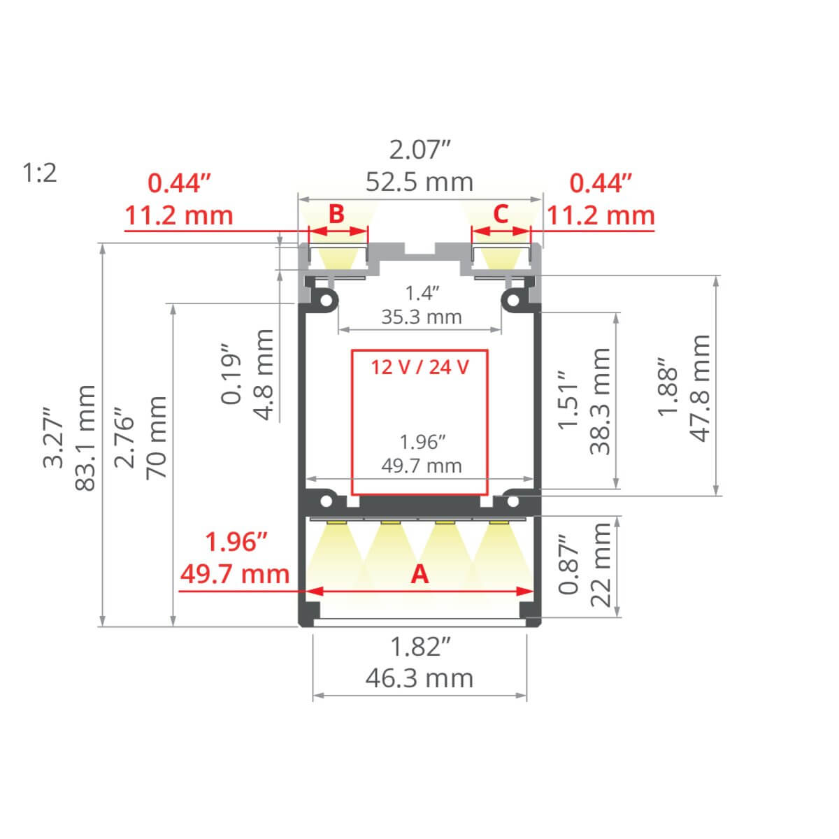 - Montage von bis zu 4 LED-Streifen (12 mm) für direkte Beleuchtung