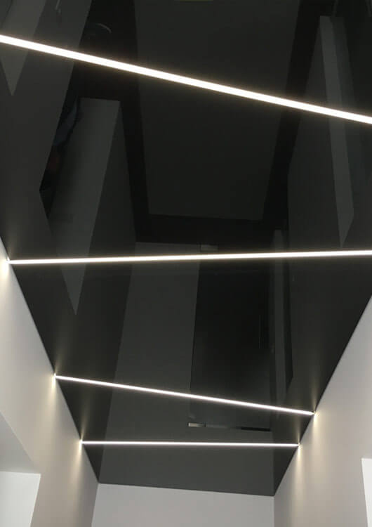 Aufhängung: Bei der Verwendung von Gipskartonplatten mit der Stärke von 12,5 mm wird das LED Profil in die Fuge zwischen zwei Gipskartonplatten genau hineingepasst und mit passenden Schrauben befestigt. Anschließend wird die neue Decke in die vorhandenen Spanndeckenleiste gespannt. Des Weiteren kann die Alu-Leiste von der Decke in horizontaler Richtung aufgehangen/abgehängt werden. Der Federbügel dient der Befestigung und Abhängung von Spanndecken-Profilen mithilfe des FOLHAK Montageprofils, um lange Lichtlinien in der Spanndecke zu erzeugen.
