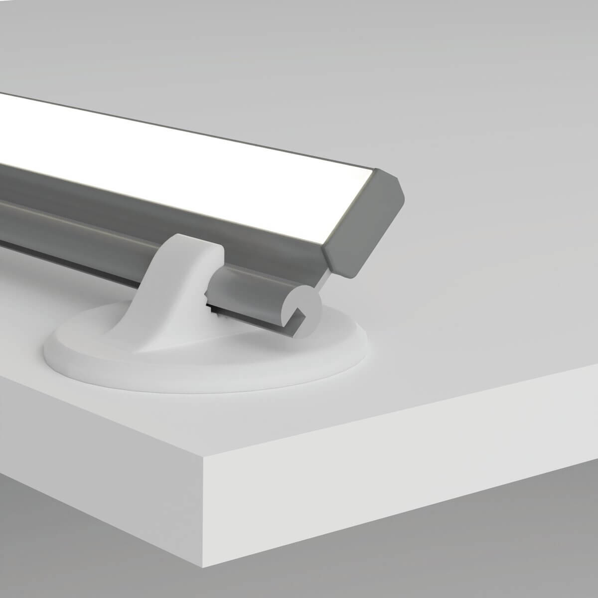 Aufputzmontage: Das Profil wird mit Hilfe des Befestigungsclips POLI eingeklickt und an den Untergrund befestigt. Die Montage des Clips auf den Untergrund erfolgt mit einem Montagekleber.