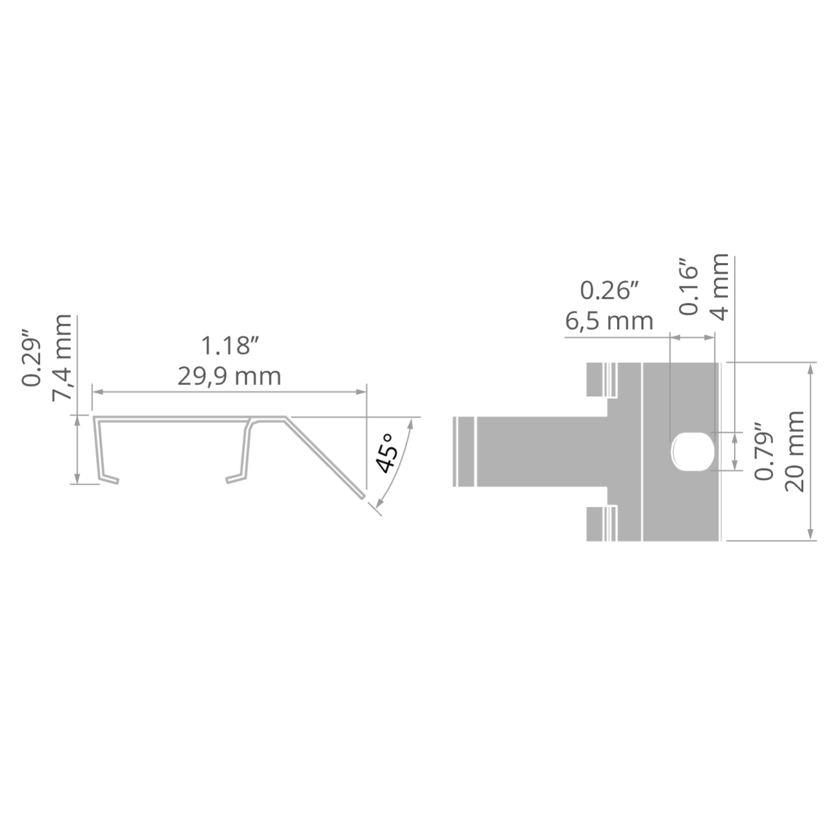 Der Befestigungsclip PDS-STN-45D dient zur Aufputzmontage des LED-Profils. Die Befestigung kann sowohl für Innen-als auch für Außenbeleuchtungsanlagen verwendet werden, da sie wetterbeständig ist. Ein Vorteil der Klemme ist die einfache Demontage der Leuchte. Wir empfehlen 2 Klemmen pro Meter eines LED-Profils. Montiert wird die Befestigung mithilfe einer Senkkopf-Schrauben von maximal 3 mm Durchmesser an der Oberfläche (Schrauben sind nicht im Lieferumfang enthalten). Das LED-Profil rastet am Befestigungsclip mühelos ein.