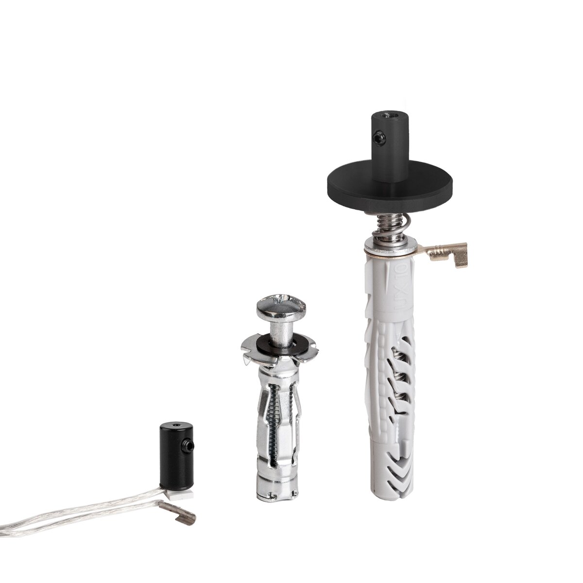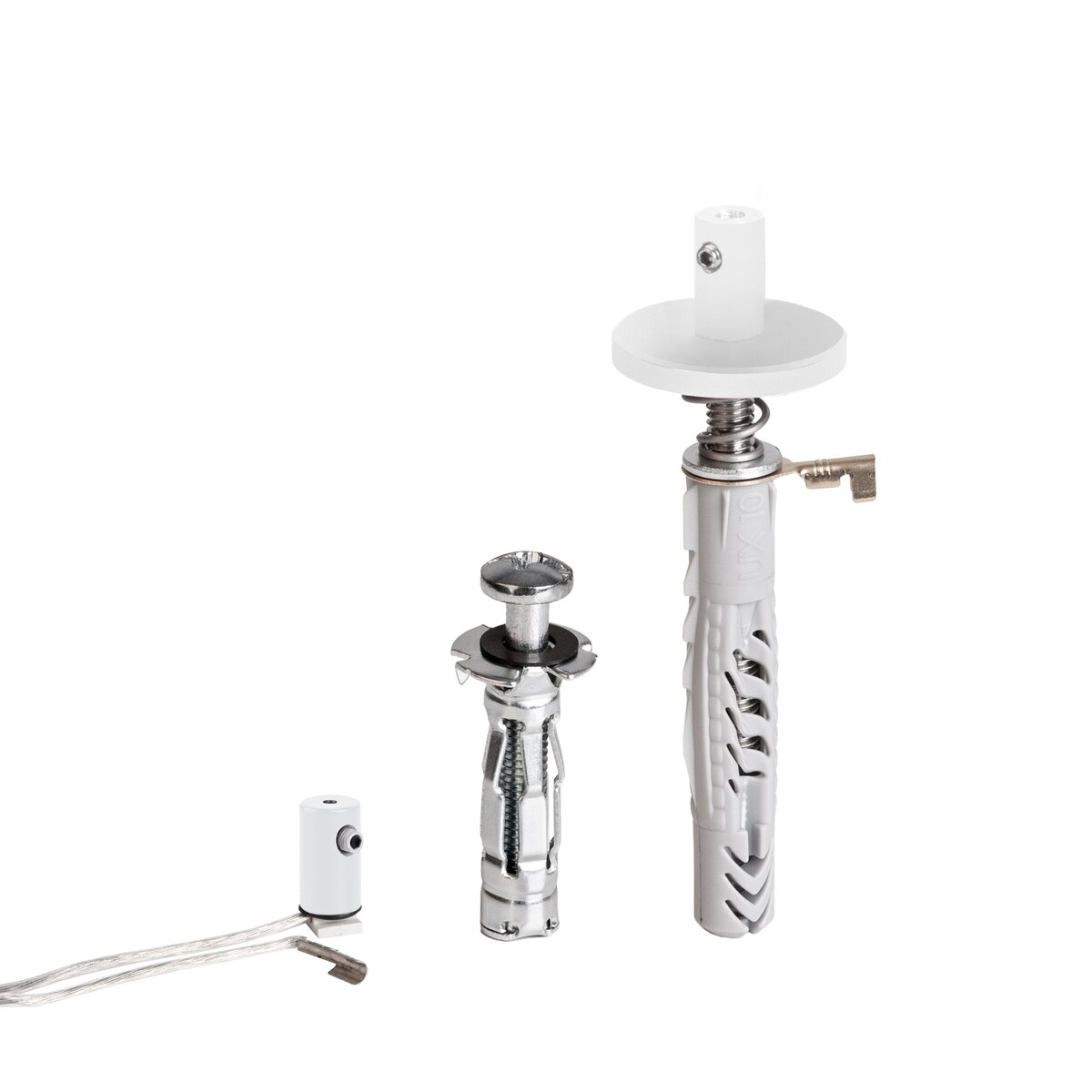 Dieses Set dient der Abhängung in Längsrichtung über ein Stahlseil . Es ermöglicht eine einfache Einstellung der gewünschten Höhe der Leuchte mit einem Schiebemechanismus und einem Stahlseilschloss. Das Set kann an Holz, Mauerwerk, Gipskarton mit einer hohen Tragfähigkeit bis zu 20 kg befestigt werden.