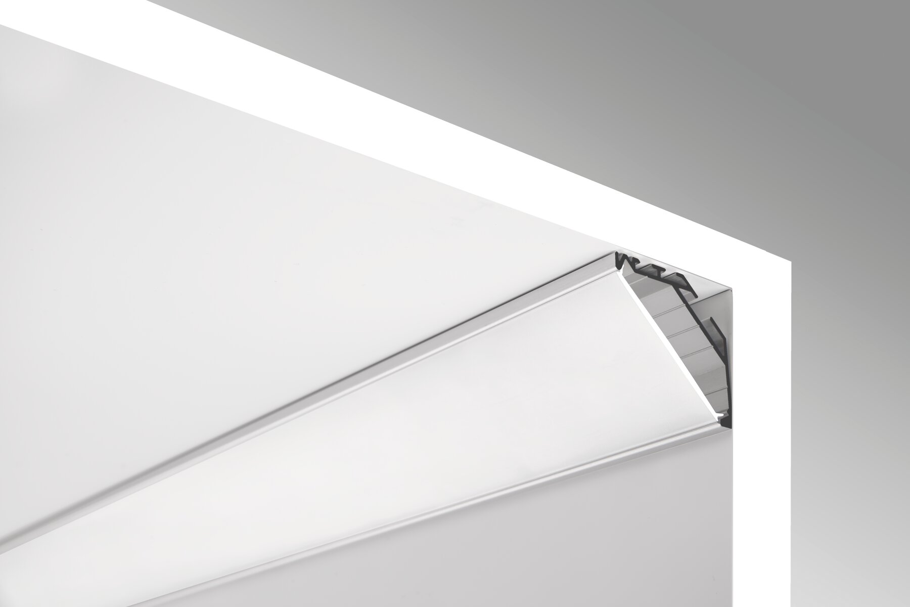 Das LED Alu-Eckprofil KOPRO wird zur Beleuchtung von Innenräumen, Akzentbeleuchtung oder bspw. dekorative Beleuchtung in Schaufenstern verwendet. Das Winkel-Profil ist für den Bau von Eck- und Winkelleuchten wie z.B. für die Beleuchtung von Wänden, Decken, Arbeitsplatten, Nischen, Küchen geeignet. Der Lichtaustritt ist um 45° geneigt. Ein Vorteil dieses LED-Profils ist der Hohlraum an der Rückseite der ALU-Eck-Leiste, welcher eine verdeckte Führung der Versorgungskabel und Stromverteilungen ermöglicht. Die Aluminium-Leiste verfügt über das sog. "kleine Schloss", das Dank der ZM-Verbinder das Profil in unterschiedliche Richtungen verlängern kann. Die Aluminiumleiste ermöglicht die Installation von bis zu zwei LED-Streifen.
