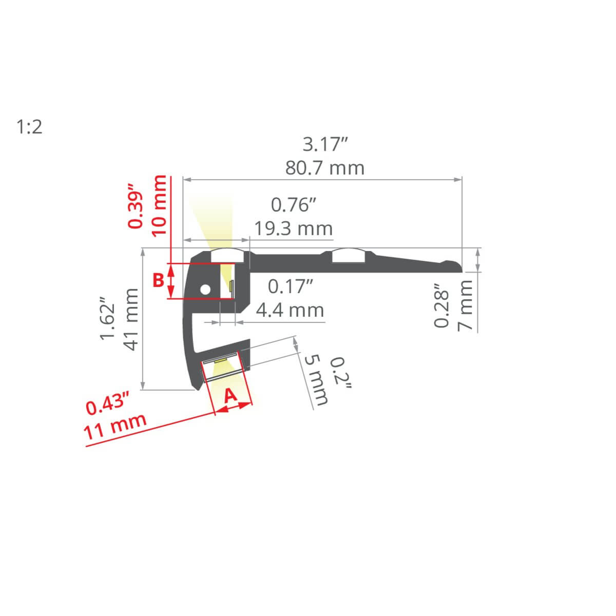 Aufputzmontage: Das Treppenstufenprofil STEP wird mit den passenden Schrauben an den Stufen montiert. Es besitzt auf der oberen Seite zwei Antirutschstreifen. Unter den vorderen Antirutschstreifen ist eine Nut für die LED-Band Montage vorgesehen. Dort passt ein 10 mm LED Streifen hinein, welcher nach oben strahlt. Auf der unteren Seite wird ein LED Streifen mit einer Breite bis zu 11 mm montiert, welcher die Trittfläche vor der Stufe beleuchtet.