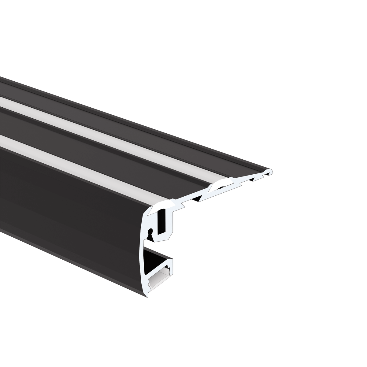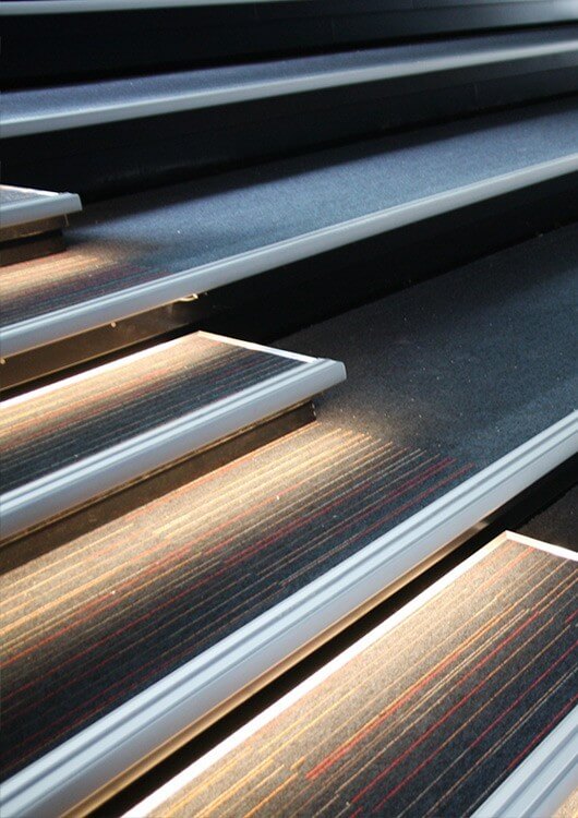 Das LED Treppenstufenprofil STEP ist ein Alu-Profil mit zwei Lichtaustritten. Es dient als Trittfläche der darunterliegenden Stufe und Makierungsleuchte auf der Profiloberseite. Das LED Profil eignet sich für die Beleuchtung von Treppen und Podestumrandungen im Innenbereich. Es wird zur Absicherung des Treppenrandes mit integrierter Warnbeleuchtung verwendet und bietet zusätzlichen Schutz der Stufe. Unser Treppenstufenprofil wird oft in öffentlichen Gebäuden wie Kinos, Einrichtungshäuser, Restaurants und Hotels eingesetzt, wo die Podeste und Stufen übersehen werden könnten. Die Aluminiumleiste ermöglicht die Installation von einem LED-Streifen.