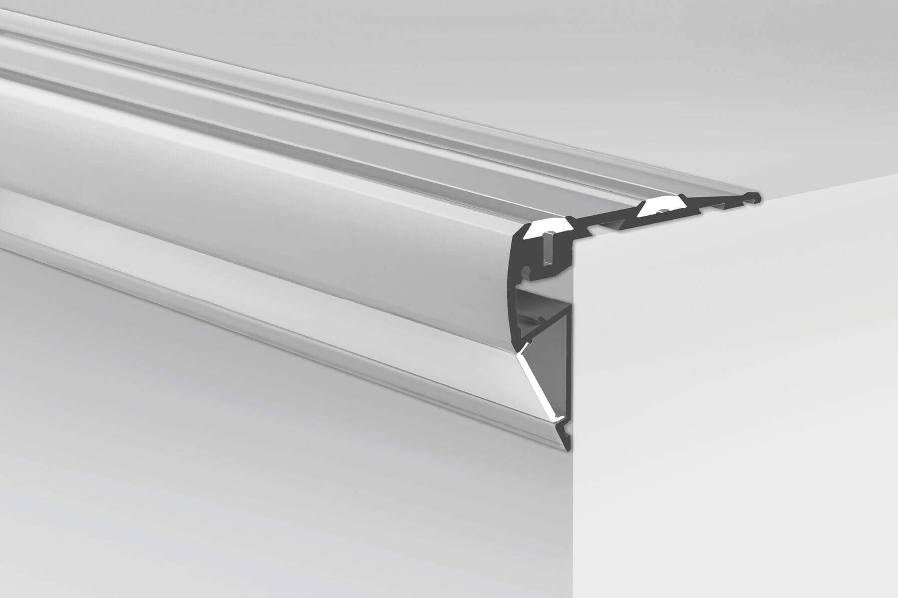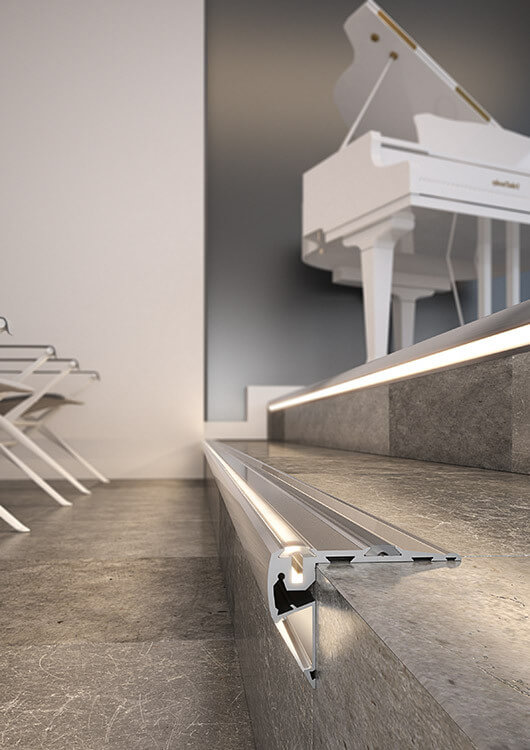 Das LED Alu-Profil STEPUS ist ein Treppenstufenprofil mit zwei Lichtaustritten. Es dient als Trittfläche der darunterliegenden Stufe und Markierungsleuchte auf der Profiloberseite. Das LED Alu-Profil eignet sich für die Beleuchtung von Treppen-und Podestumrandungen. Es wird zur Absicherung des Treppenrandes mit integrierter Warnbeleuchtung verwendet und bietet zusätzlich einen Schutz der Stufe. Unser Treppenstufenprofil wird oft in öffentlichen Gebäuden wie Kinos, Einrichtungshäuser, Restaurants und Hotels eingesetzt, wo die Podeste und Stufen übersehen werden könnten. Die Aluminiumleiste ermöglicht die Installation von einem LED-Streifen.