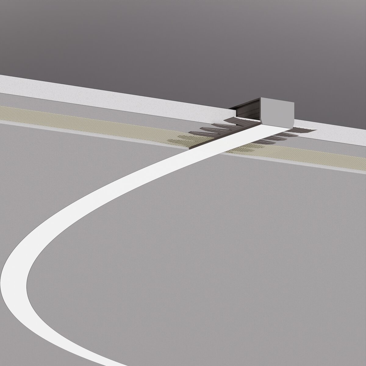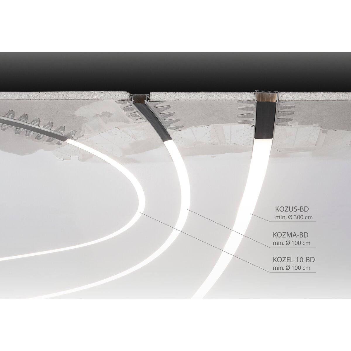 KOZUS BD ist ein verputzbares LED-Profil, das speziell für den Einsatz in gebogenen Lichtlinien entwickelt wurde. Die Konstruktion ermöglicht das Biegen in der Leuchtfläche, sowohl als Hauptbeleuchtung als auch zur dekorativen Akzentuierung. Die Alu-Leiste ist dafür konzipiert, in der Lichtaustrittsfläche gebogen zu werden, ohne die Struktur oder Lichtverteilung negativ zu beeinflussen. Die LED-Lichtquelle liegt plan mit der Decken- oder Wandoberfläche, was eine moderne, nahtlose Lichtwirkung erzeugt. Durch die spezielle Formgebung kommt es zu keiner Beeinträchtigung der tragenden Decken- oder Wandstrukturen. Nach dem Verputzen sind die Aluminiumelemente nicht sichtbar, lediglich die homogen leuchtende Lichtlinie bleibt als Designelement erhalten. Die Aluminiumleiste ermöglicht die Installation von bis zu zwei LED-Streifen.