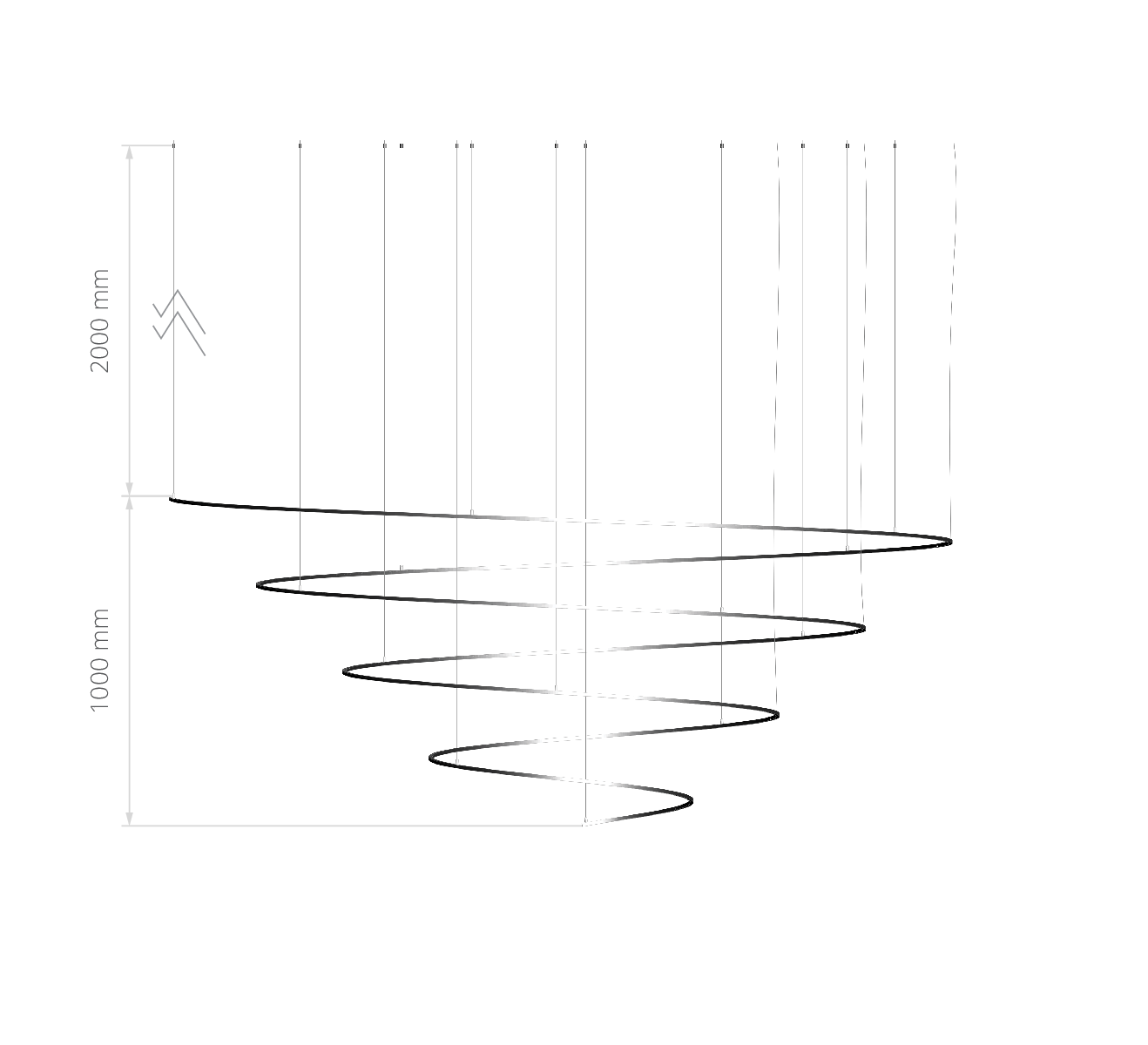 Die Installation erfolgt über ein spezielles Aufhängesystem mit stabilen Stahlseilen, die eine sichere und flexible Montage ermöglichen. Die Position und Höhe der Leuchte können ganz einfach durch Verschieben oder Kürzen der Seile angepasst werden, sodass sich die Spiralleuchte optimal in die jeweilige Raumgestaltung einfügt. Im Lieferumfang sind Stahlseile mit einer Länge von 1,5 Metern enthalten, was genügend Spielraum bietet, um die Leuchte in unterschiedlichen Höhen abzuhängen. Bei Bedarf können auch längere Seile bestellt werden, um die Montage in sehr hohen Räumen zu realisieren.