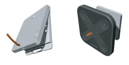Die Fernbedienung selbst ist magnetisch. Im Lieferumfang enthalten ist eine Grundplatte zur freien Montage, mit Metallplatten zur magnetischen Aufnahme.