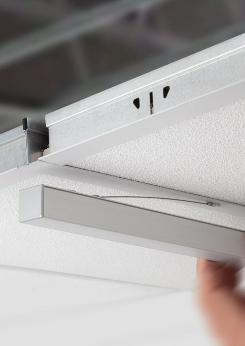 Das Sicherungsseil wird an der Leuchte durch Einsetzen der Kupplung in die ZM-Nut des Profils montiert und anschließend mit einer Inbusschraube fixiert. Die Verbindung wird durch Anziehen der Schraube sicher arretiert. Das andere Ende des Seils wird an der Montagefläche mit einer passend ausgewählten Schraube befestigt. Dadurch entsteht eine zusätzliche Sicherung zwischen Leuchte und Untergrund.